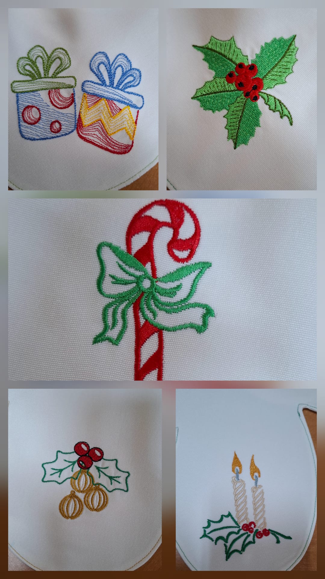 | RICAMO | candela, bacche con sfere natalizie, candy cane, tamburo, pacco regalo, agrifoglio |